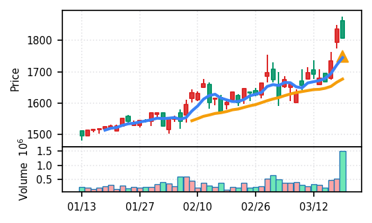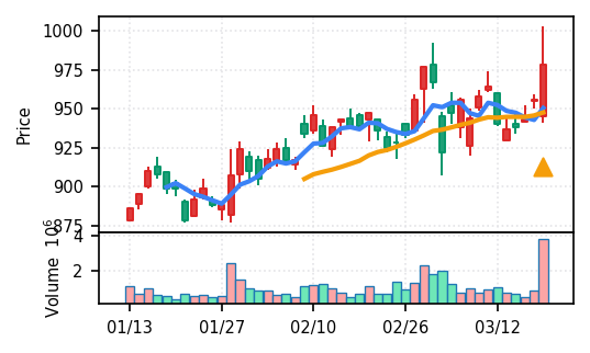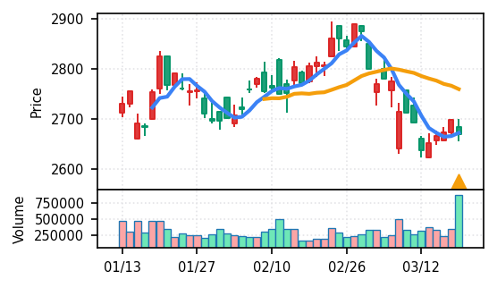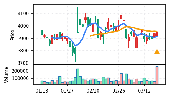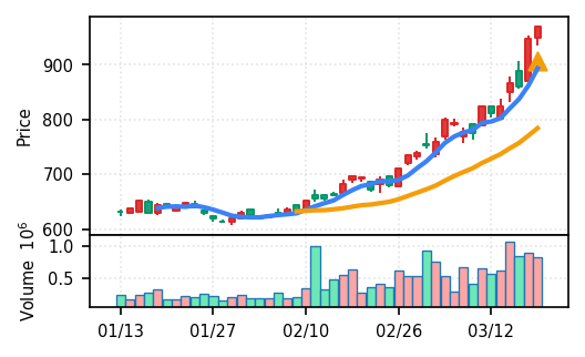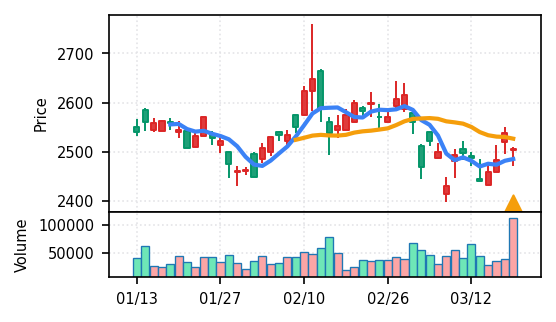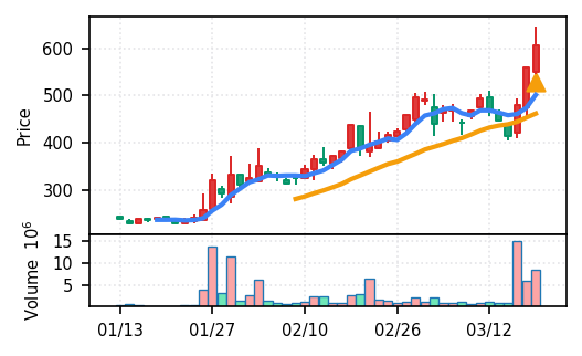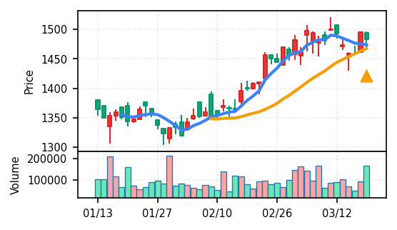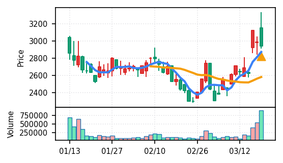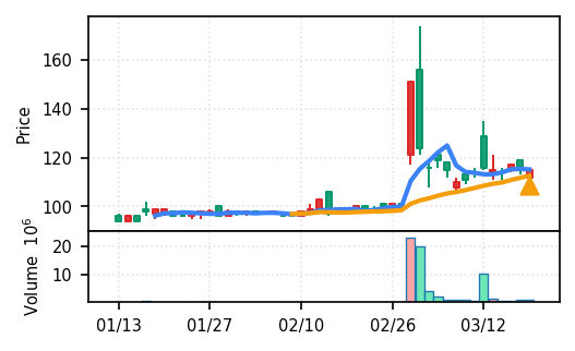 インフォメティス(281A) [グロース/情報通信業]は最高スコア0.878、出来高Zスコア8.9σを記録。引け足0.60は上値での保合形状を示唆し、初動段階での買い興味が相応程度持続している状況が観察される。ブレイク✓・上昇トレンド✓の確認も取れている。