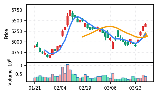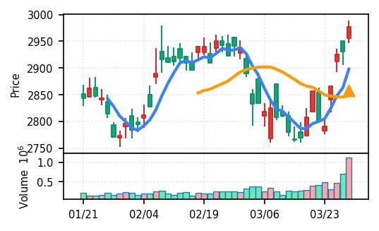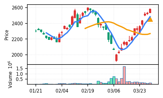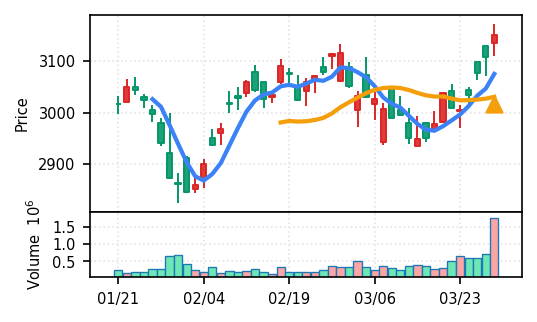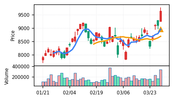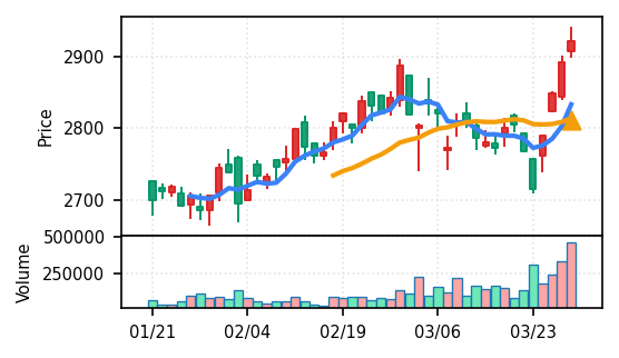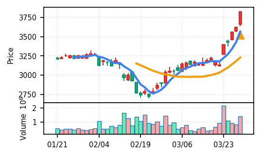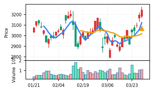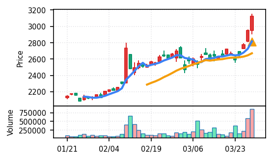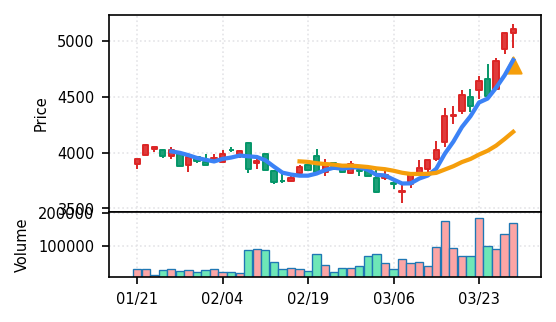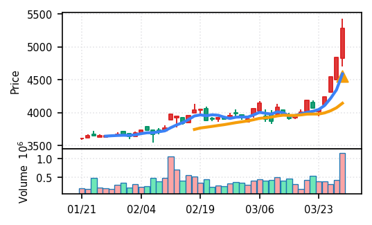 片倉コープアグリ(4031)・多木化学(4025)・小林製薬(4967)・日油(4403)など基礎化学・医薬品セクターの銘柄も均等に検知。出来高Zスコアは全体的に低め(1~2σ程度)だが、ブレイク・上昇トレンドは確認。機関投資家の定期リバランスが進行している可能性。