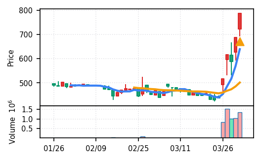 スコア第2位・第3位の ライフドリンク カンパニー(2585) (スコア0.783)と 栄研化学(4549) (スコア0.778)も、医薬品・食料品セクターの代表として注視対象。栄研化学は出来高5.1σで堅調な上昇。