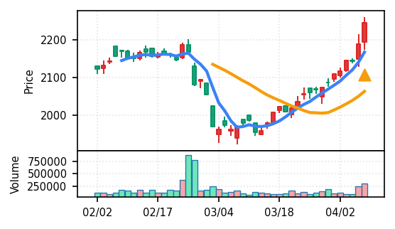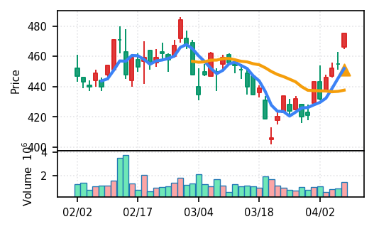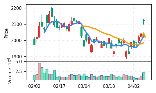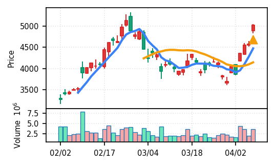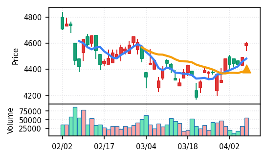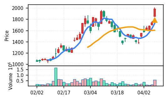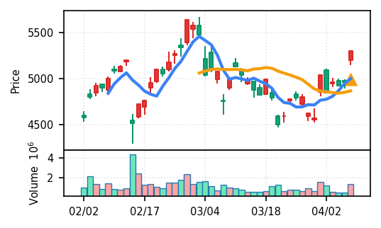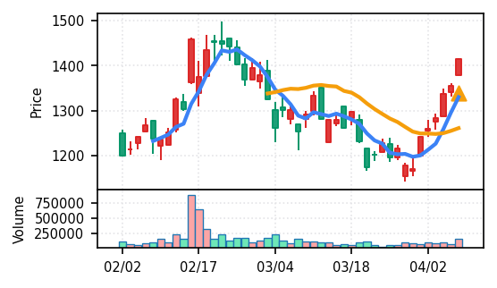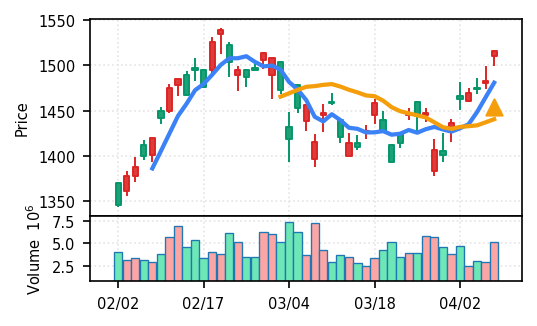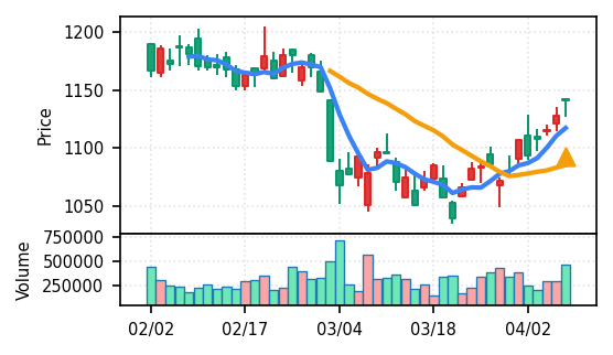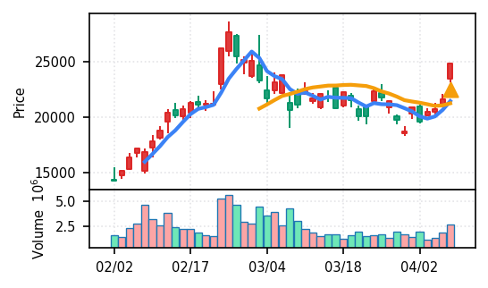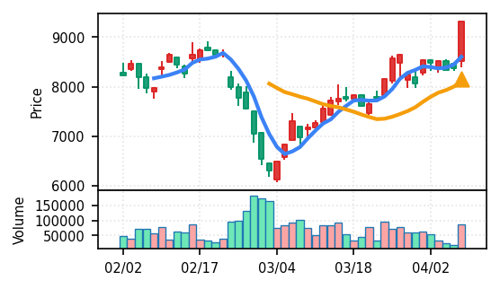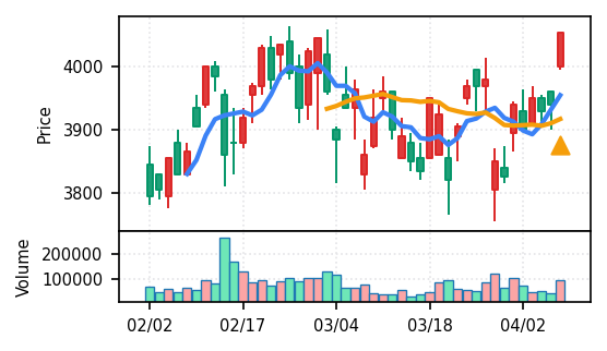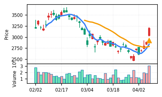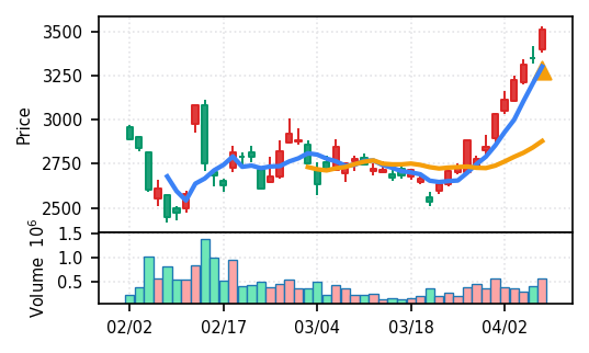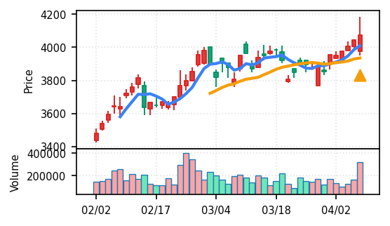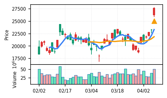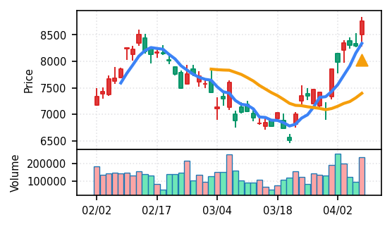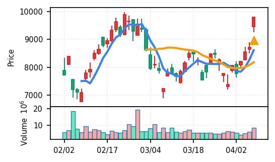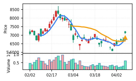 2026年4月8日の初動検知では、スクリーニング対象50銘柄全てが上昇トレンド・ブレイク条件を満たした。スコア最高値は0.752(フジ)、最低値は0.646(ニシオホールディングス)と、個別銘柄ごとの強度差はありながらも、市場全体が広く上昇初動を示唆している状況といえる。出来高スコア(VolZ)は古野電気(6814)の5.4σ、フジ(8278)の4.7σなど、複数銘柄で高い水準を記録。典型的な「仕掛け段階での取組み拡大」を反映している。