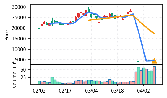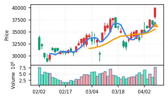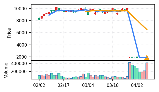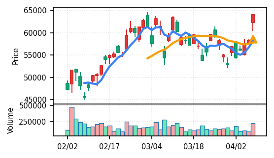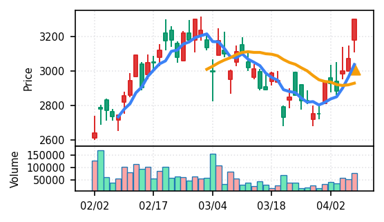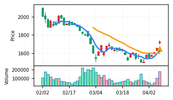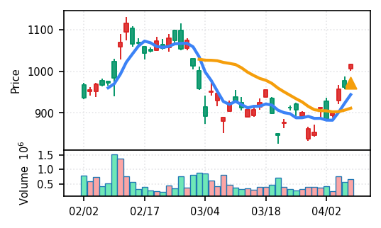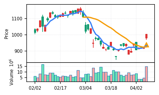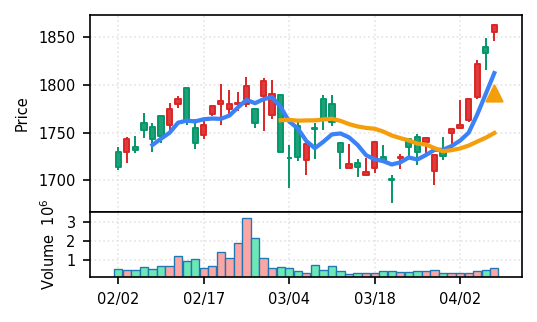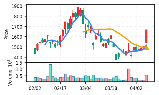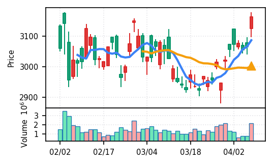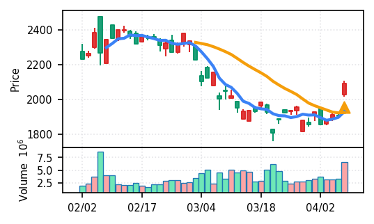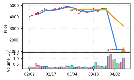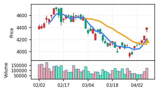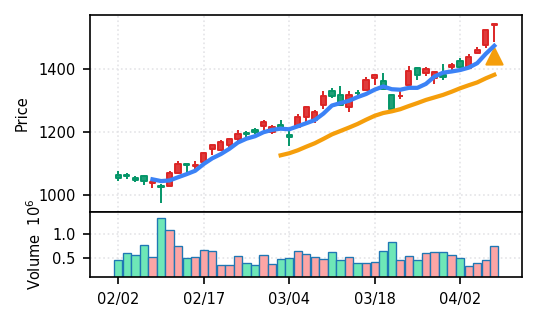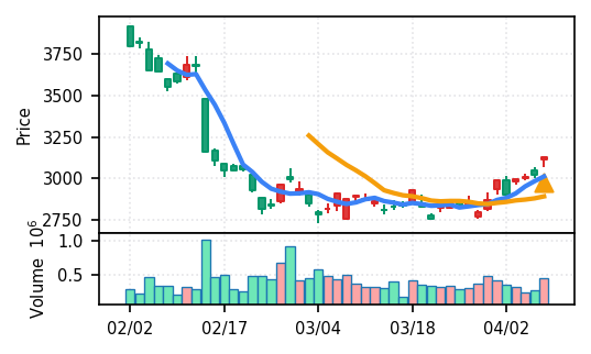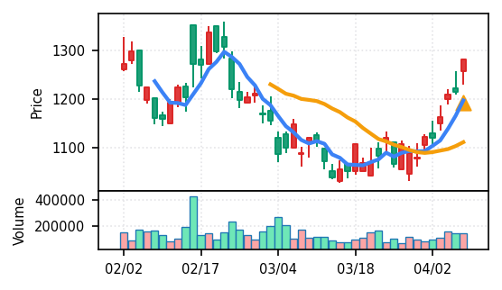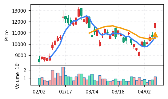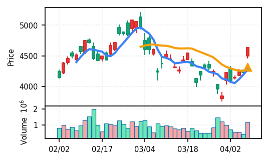 2026年4月8日の初動検知では、スクリーニング対象50銘柄全てが上昇トレンド・ブレイク条件を満たした。スコア最高値は0.752(フジ)、最低値は0.646(ニシオホールディングス)と、個別銘柄ごとの強度差はありながらも、市場全体が広く上昇初動を示唆している状況といえる。出来高スコア(VolZ)は古野電気(6814)の5.4σ、フジ(8278)の4.7σなど、複数銘柄で高い水準を記録。典型的な「仕掛け段階での取組み拡大」を反映している。
