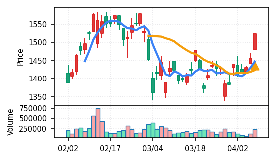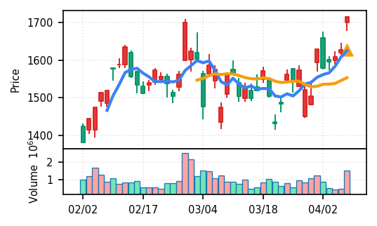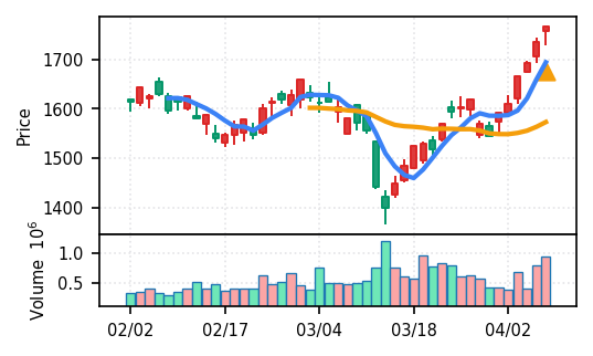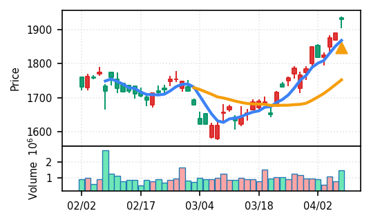 百五銀行(8368): 終値1716円、スコア0.732、引け足1.00(寄せ型)。銀行業3銘柄中トップ。完全に買い気配のまま引けた形で、初動の強さが際立つ。金融セクター全体の活性化を示唆する形式。