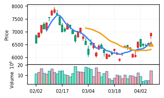古野電気(6814): 出来高スコア5.4σという異例の数値。終値7150円、スコア0.698ながら、引け足0.41と売られての引けになった。市場参加者の急増と同時に売却圧力も生じた局面と見られる。