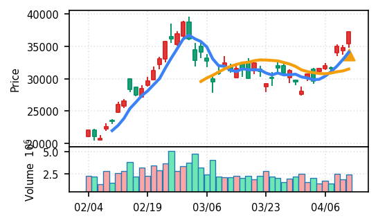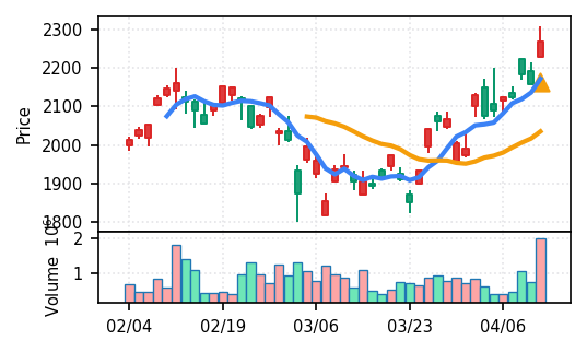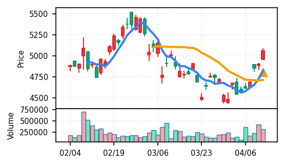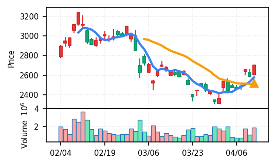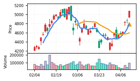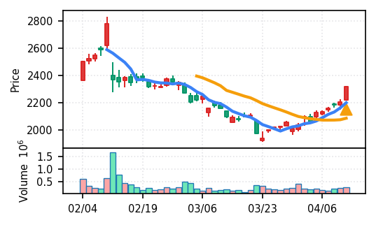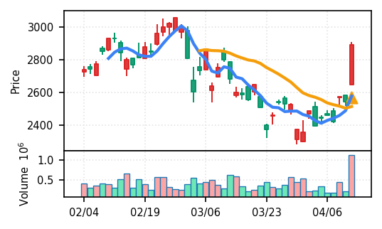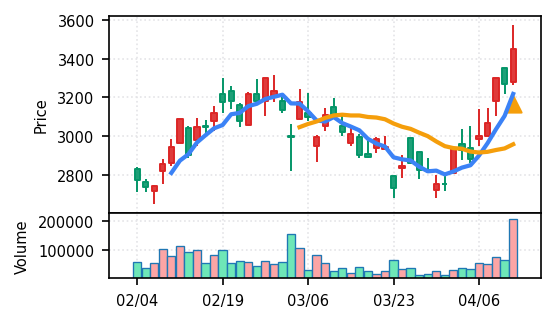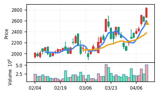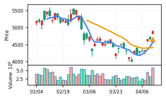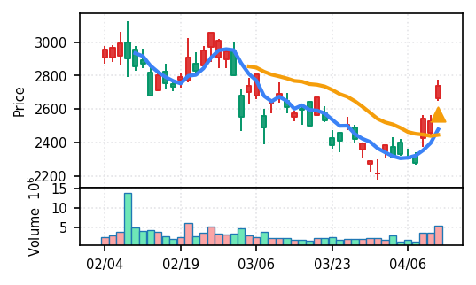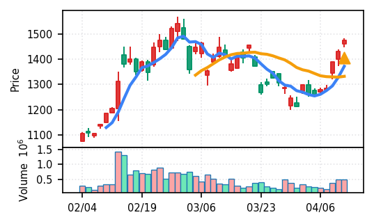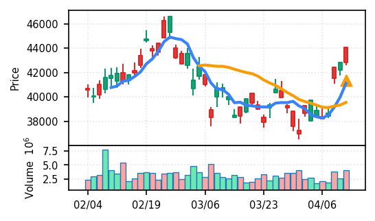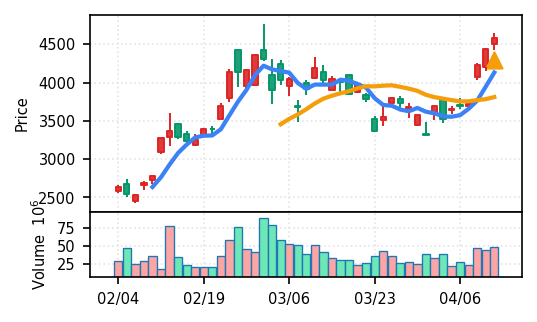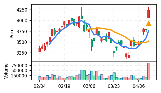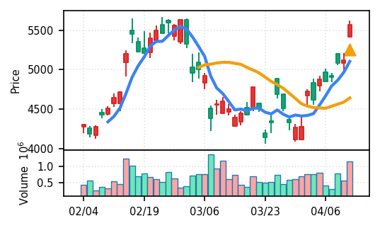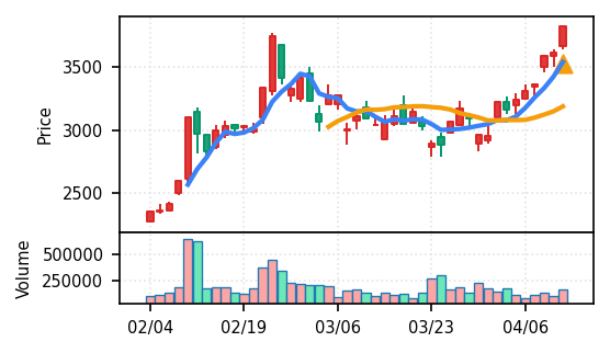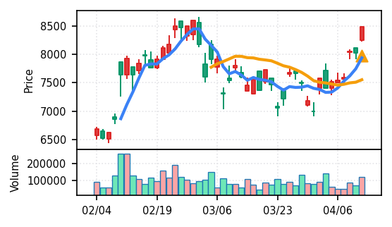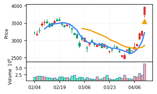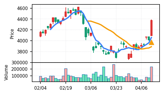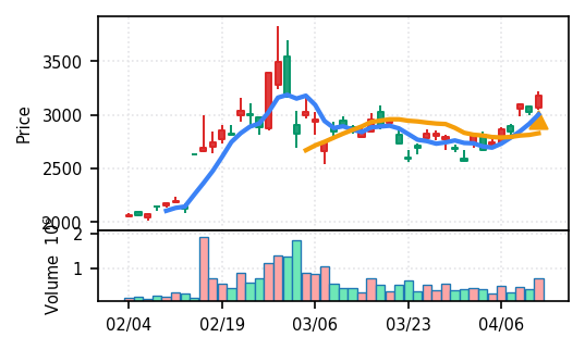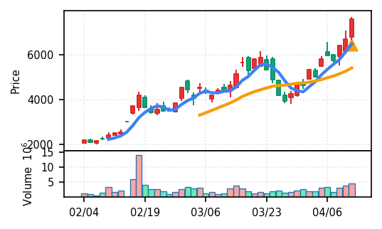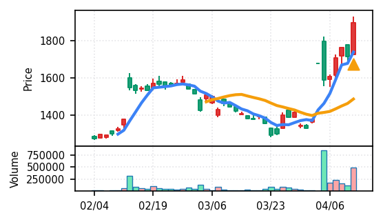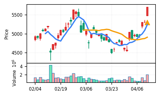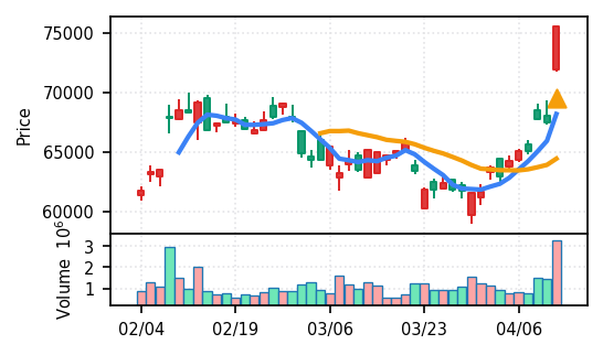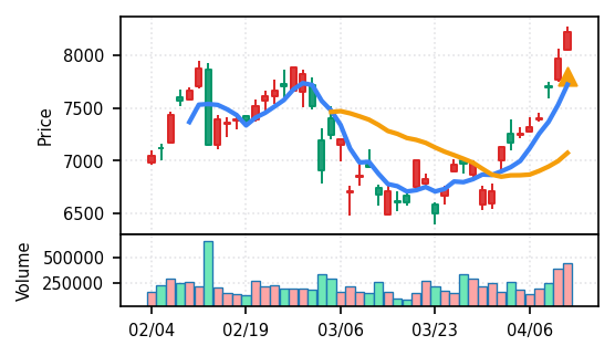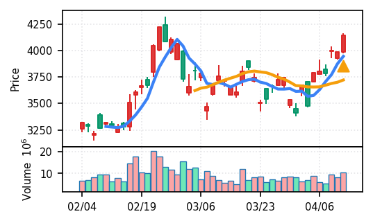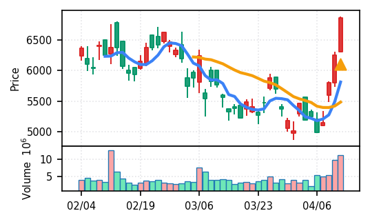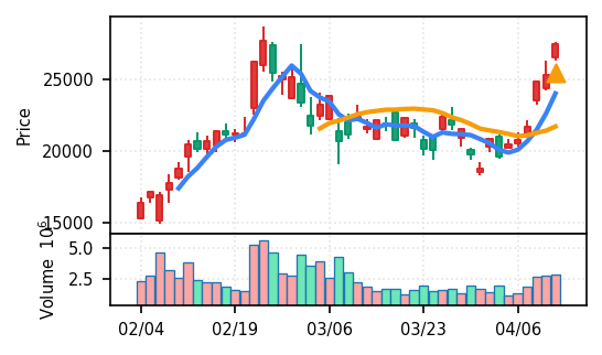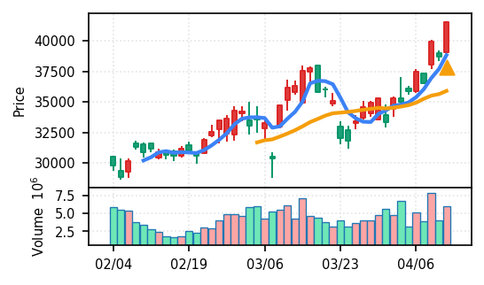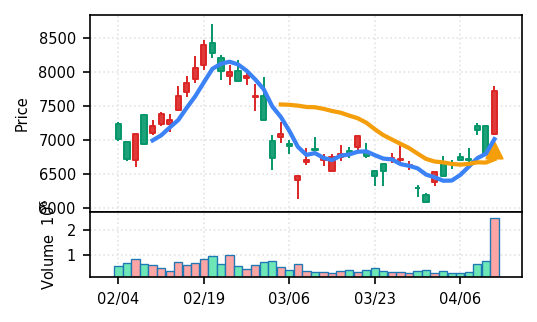 スコア0.905、引け足1.00。大型小売業が検知入り。株価水準(終値75540円)が高いため、絶対値的な出来高は控えめ(VolZ 7.6σ)だが、高値追う買い意欲は確認。