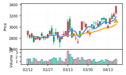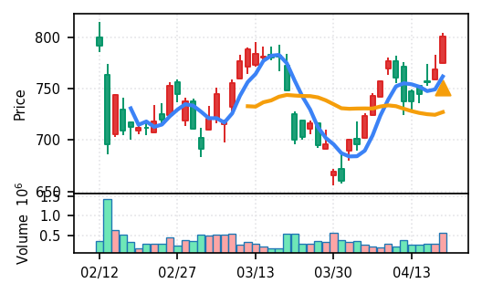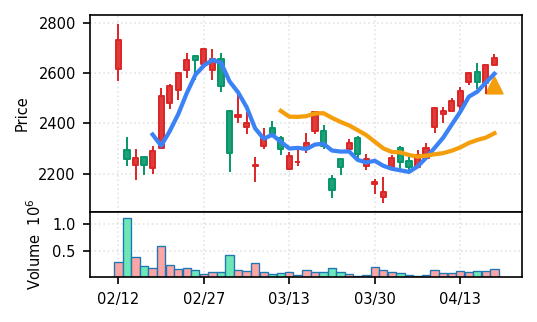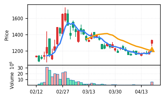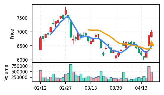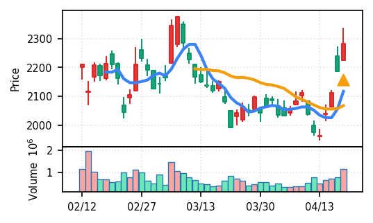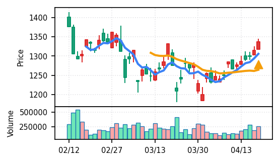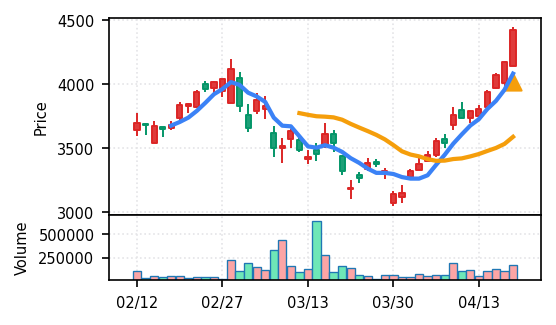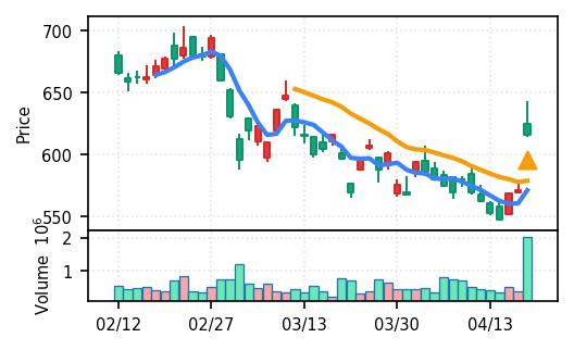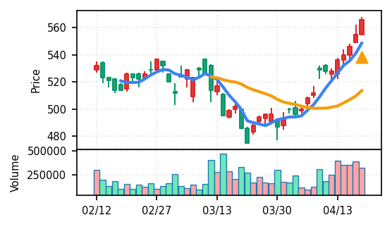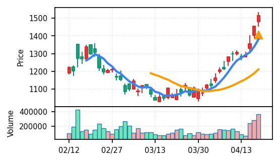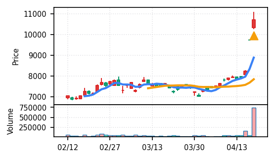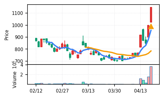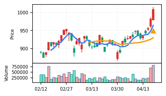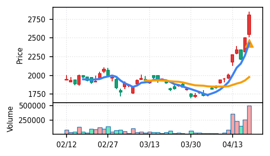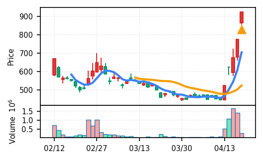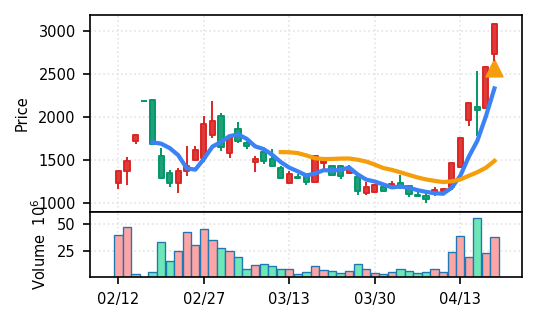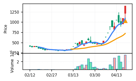- スコア0.915、VolZ 8.0σ、引け足0.97。スコア2位でありながら出来高も通常の8倍。ブレイク達成、上昇トレンド形成。