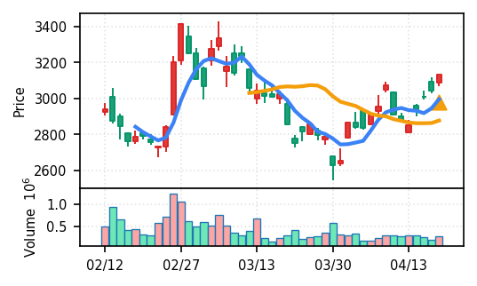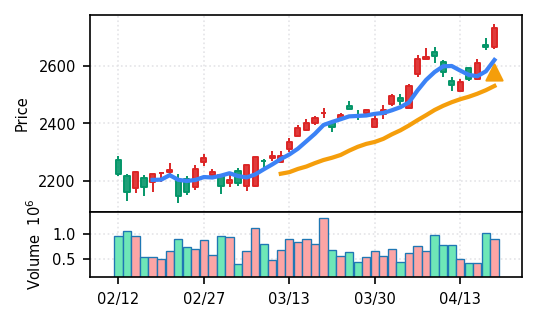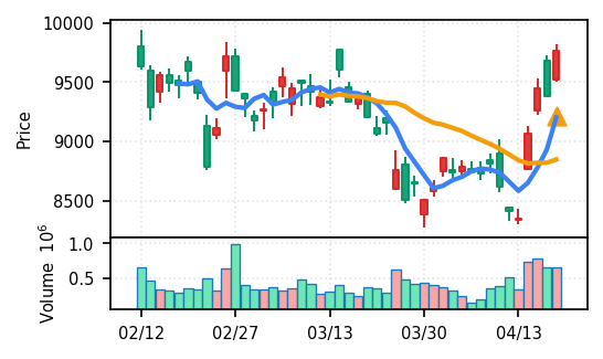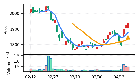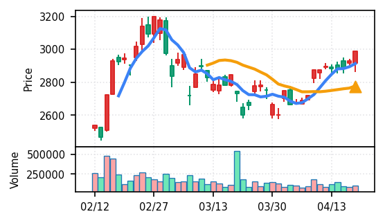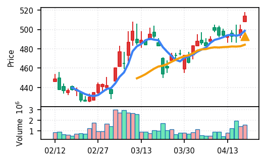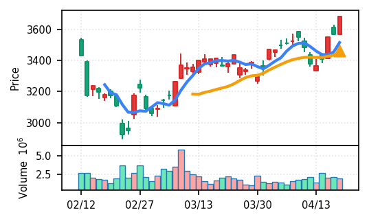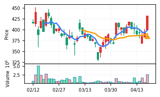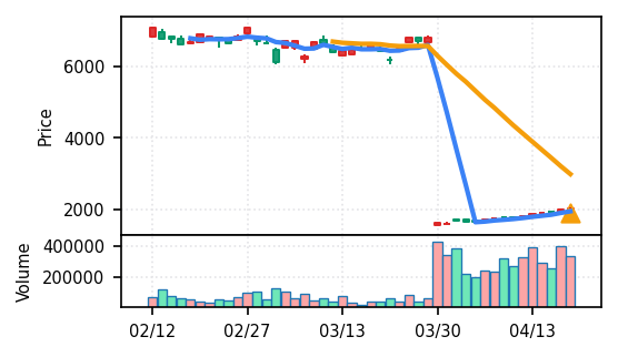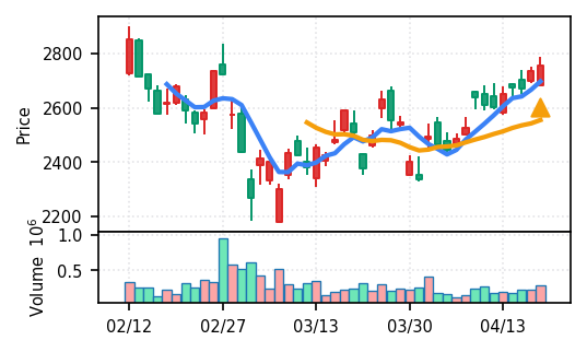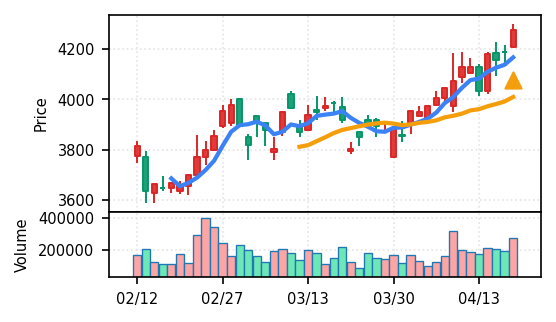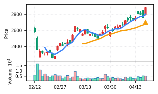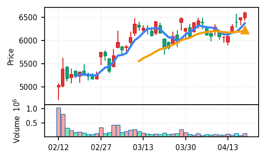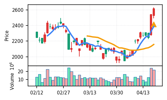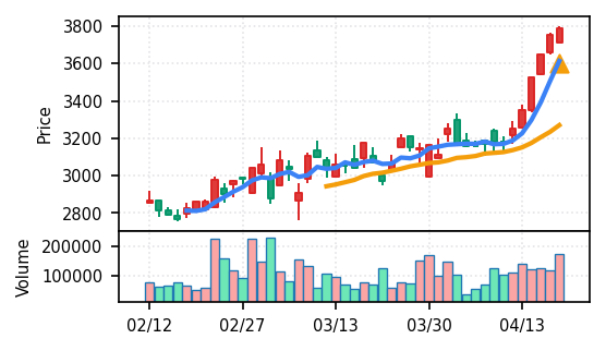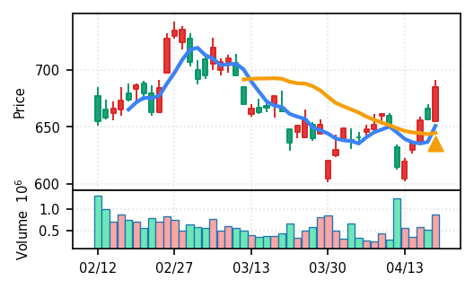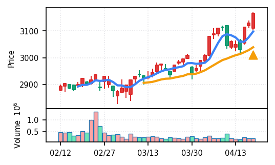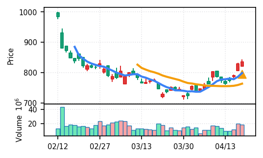 - スコア0.915、VolZ 8.0σ、引け足0.97。スコア2位でありながら出来高も通常の8倍。ブレイク達成、上昇トレンド形成。