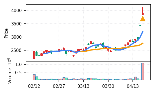 - スコア0.844、VolZ 24.7σ。最大出来高Zスコアを記録。終値3880円での完全ブレイク。引け足0.22で大幅調整、値がさ銘柄の宿命的な出来高後引け弱化パターン観察。