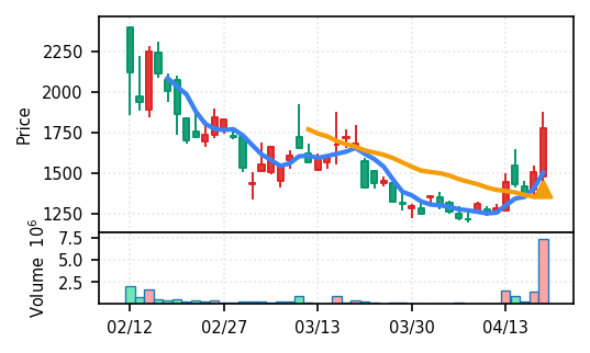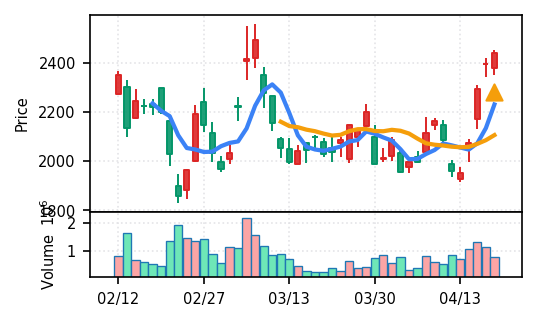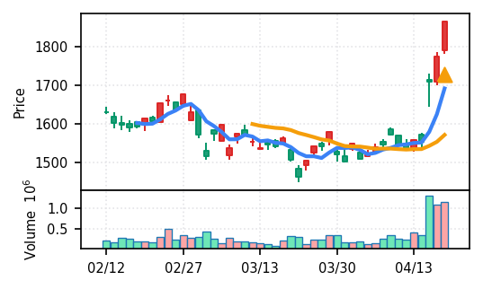 - スコア0.653、VolZ 15.6σ。出来高面で注視対象。終値1780円、上昇トレンド確認も引け足0.77。出来高の割に引け足が中位のやや不安定なパターン。