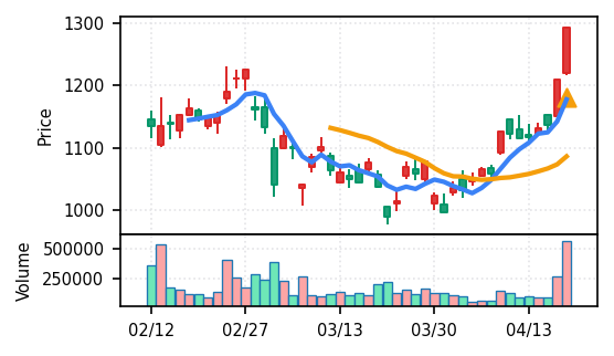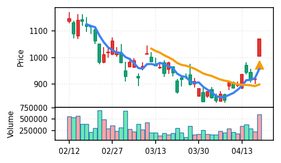 - スコア0.799、VolZ 5.0σ。終値1070円で上昇トレンド形成、引け足1.00で確実な底値圏形成。比較的安定した初期パターン。