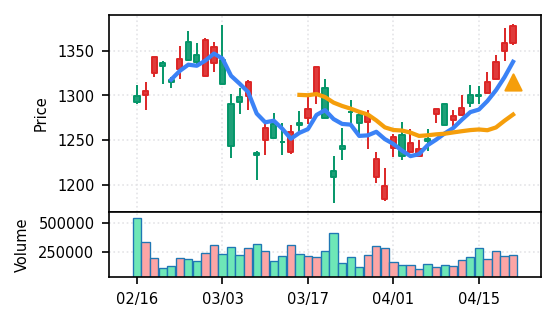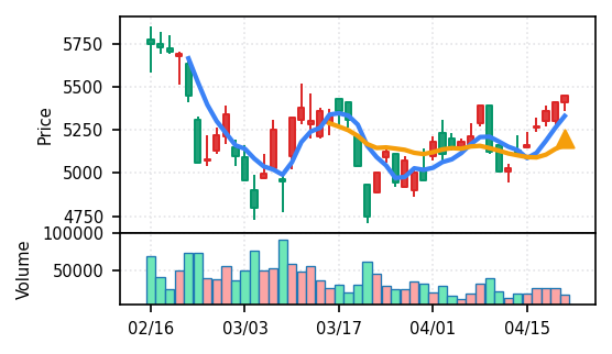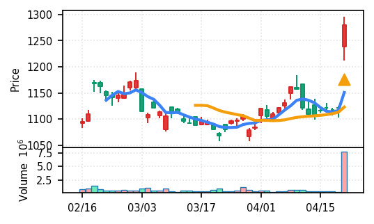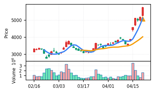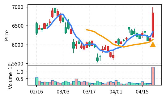 2026年4月21日の初動検知では、スクリーニング対象50銘柄すべてが新高値ブレイクを達成した。全銘柄ブレイク達成というのは市場全体が上昇基調にある明確な兆候である。トップスコアは0.964(日本電子)から下位の0.600(ノリタケ他)まで分布しており、検知強度にはばらつきが見られるものの、方向性は統一されている。出来高Zスコアの観点では、ノジマ(7419)の37.7σとエンビプロ・ホールディングス(5698)の46.7σが特に異常値を示し、機関投資家や大口の参入を示唆する動きが確認できる。