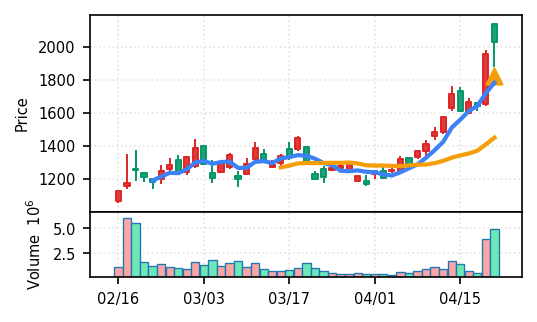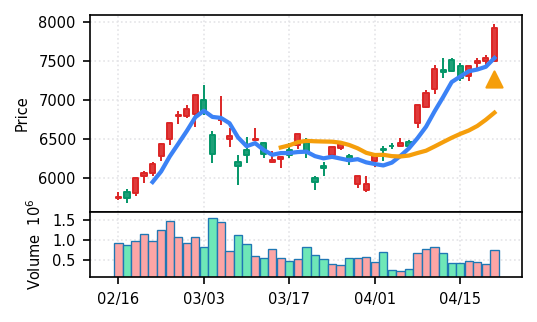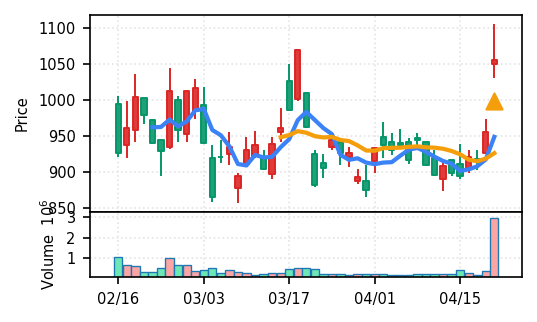 2位: ノジマ(7419) スコア0.962、VolZ 37.7σという異常な出来高増加。小売業セクターながら、機関投資家の急速な買い集めが疑われる。引け足0.81も悪くなく、短期トレンドの初期段階と考えられる。