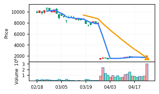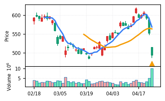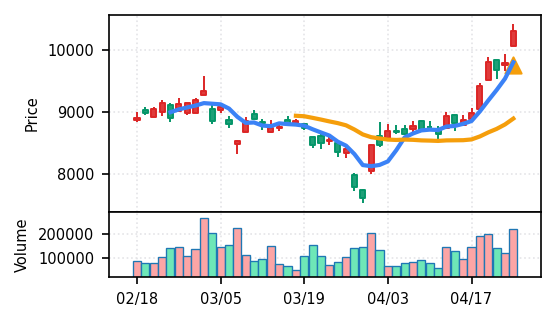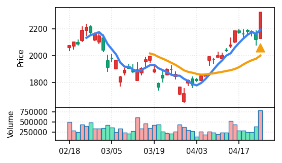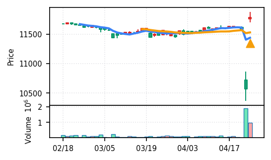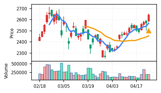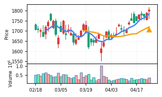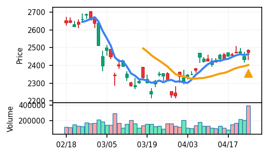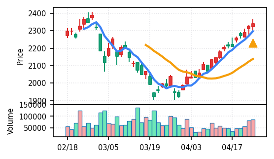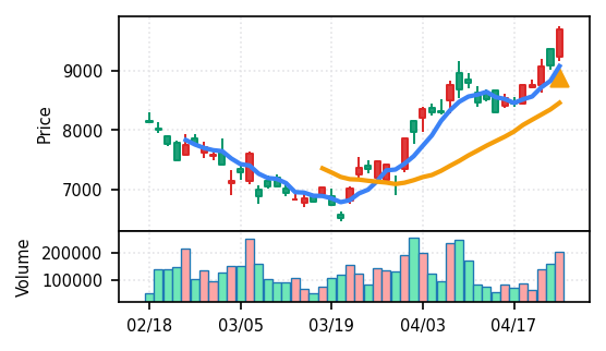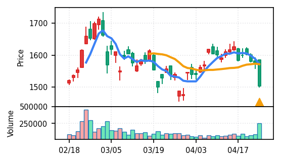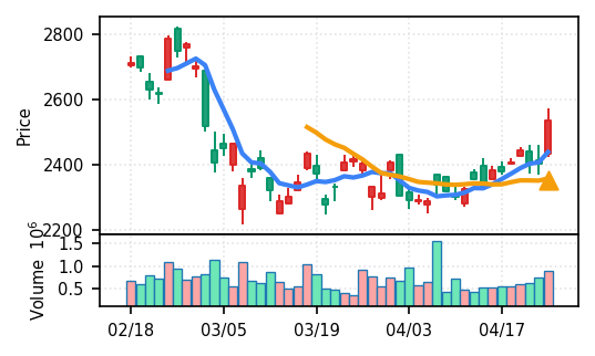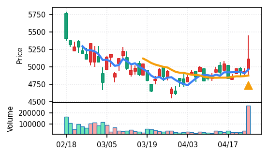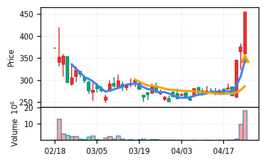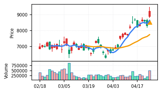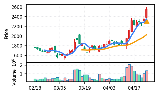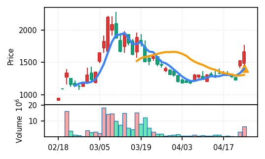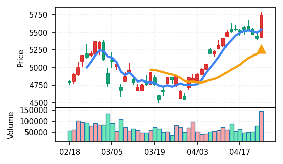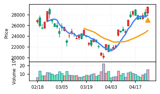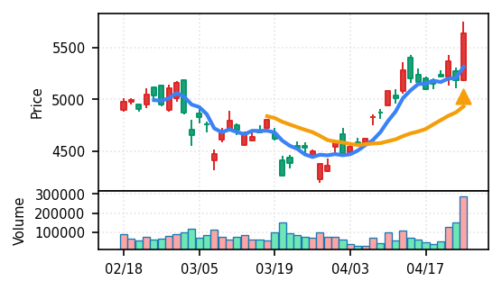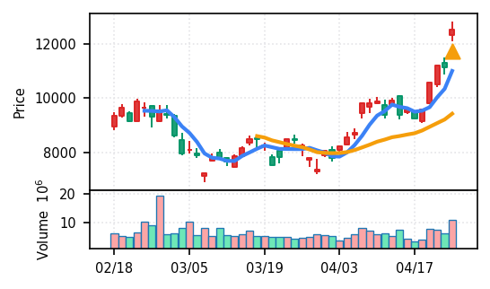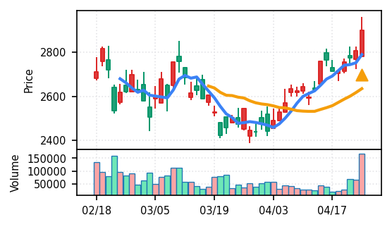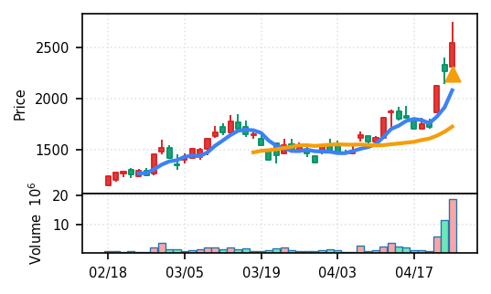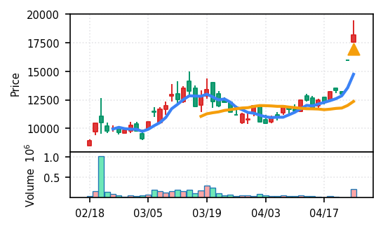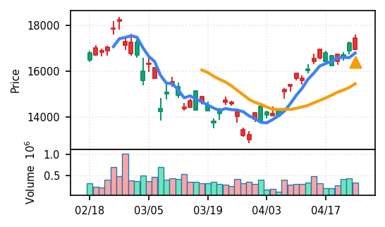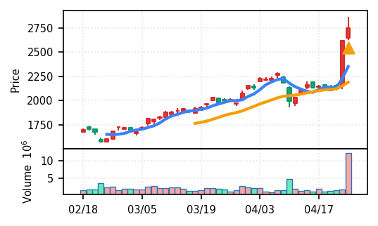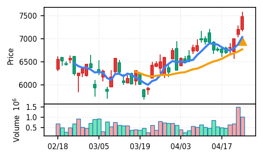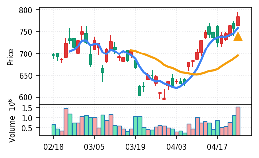 3月下旬の下げ相場から反発し、4月中盤以降は加速上昇。4月24日は出来高3.99σの急増で高値784円を更新、20日高値ブレイク達成。引け足の強さ0.65で堅調。SMA5上昇トレンド継続で短期的には上昇モメンタムが強いが、スコア17位と信頼度は中程度。過熱感の兆候に注視が必要。