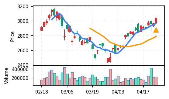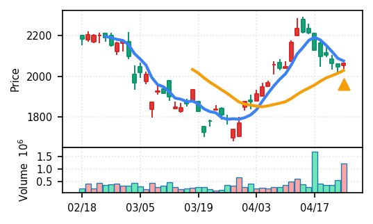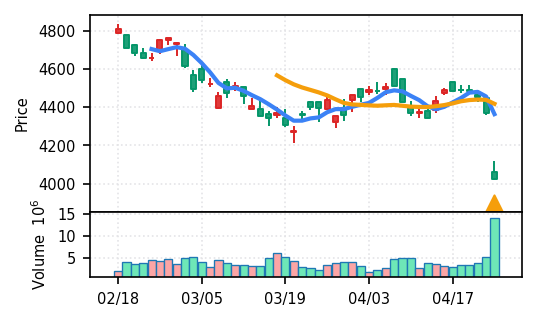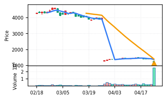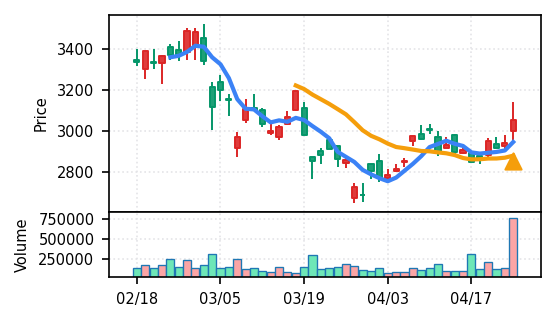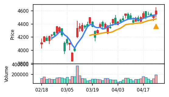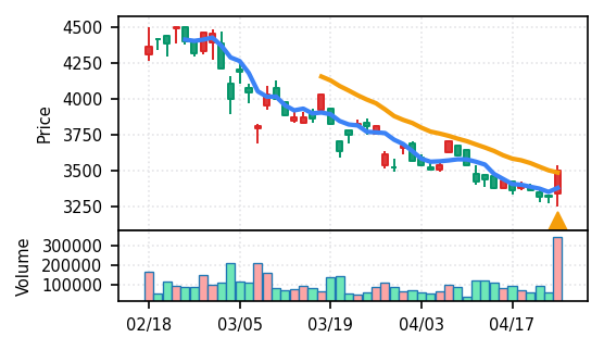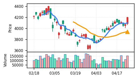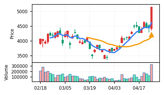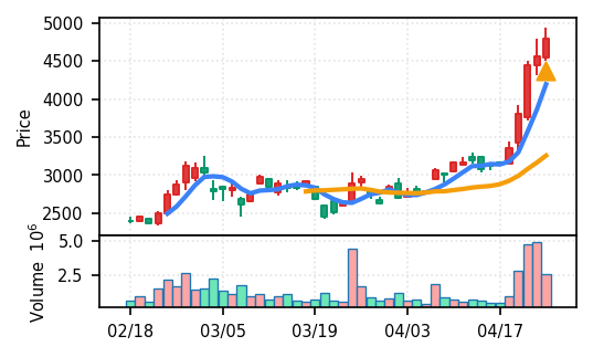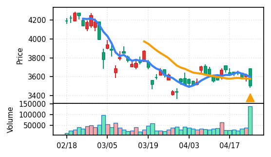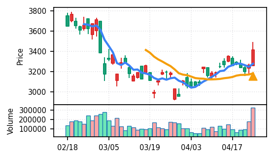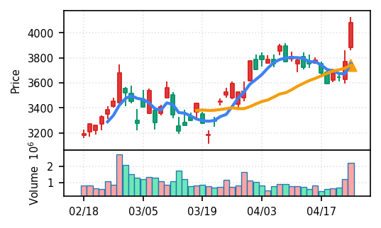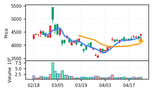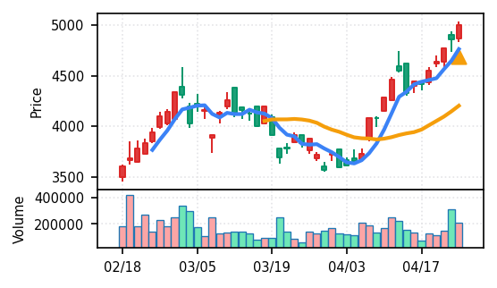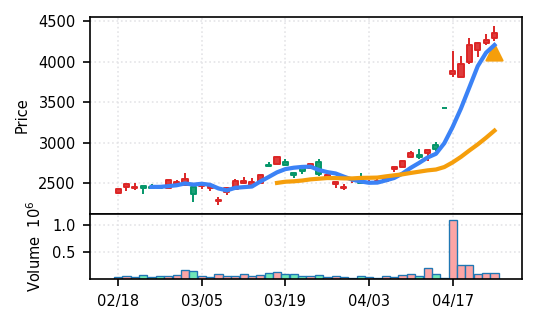 3月下旬の2780円からの上昇トレンドが継続し、4月14日以降は急騰局面。本日は3980円で20日高値ブレイク、引け足の強さ0.98(高値引け)で上昇トレンド継続を示唆。ただし出来高Zスコア0.33σと相対的に抑制されており、スコア0.609(ランク25/50)は中程度の信頼度。過去3営業日の調整局面からの戻りシグナルだが、過熱警戒が必要。