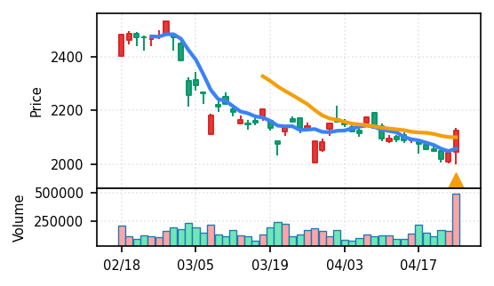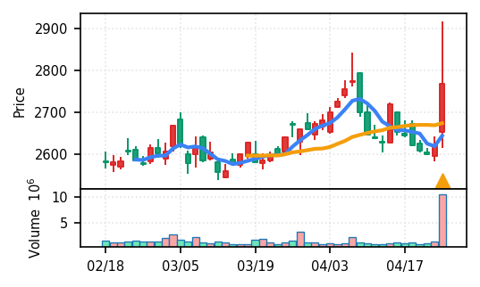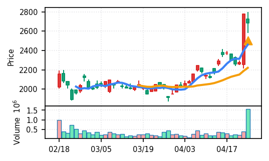 ランク4・スコア0.905で高い信頼度。出来高が12.56σの異常値で過去30日比約7倍に膨張。2026年3月下旬から約45%上昇し、4月23日の2621円から24日に2750円へ継続上昇。SMA5>SMA20確認で短期上昇トレンド継続中だが、急速な上昇幅と過熱した出来高から調整局面への移行リスクを注視すべき局面。