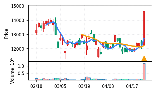 ランク10/50、スコア0.819で初動シグナルが発生。出来高は8.71σの異常値で急増し、20日高値14,350円をブレイク、SMA上昇トレンドも確認。ただし引け足の強さ0.35は中程度で、直近の下げ相場からの急反発であり、過熱感への警戒が必要。