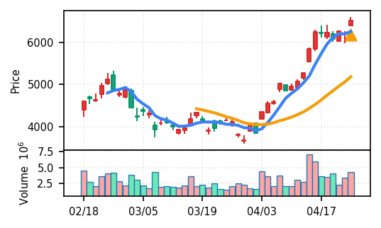 ランク9位、スコア0.828と高い信頼度。出来高が6.67σと異常に急増し、20日高値(約5430円)を大きくブレイク。終値5640円は高値引け(0.80)で力強い。SMA5上昇トレンドが継続中。3月下旬の4200円安値から約35%上昇した強気相場だが、一日で280万株超の大量出来高は過熱警戒も必要。