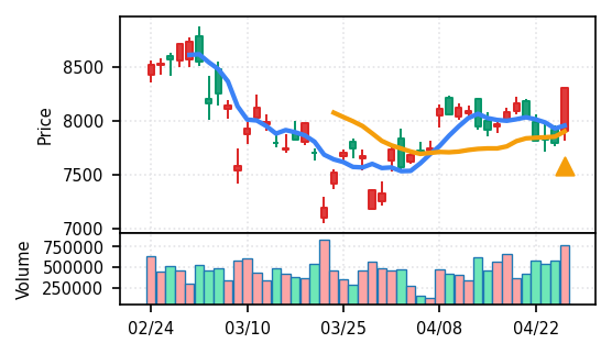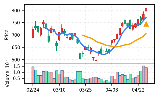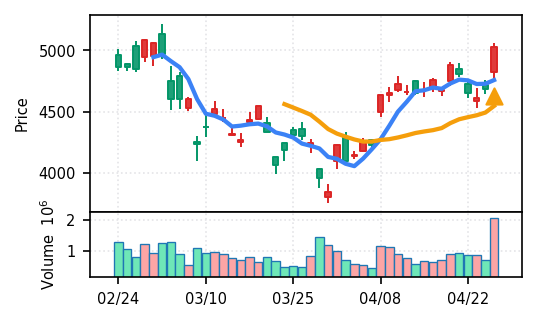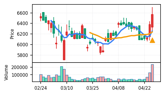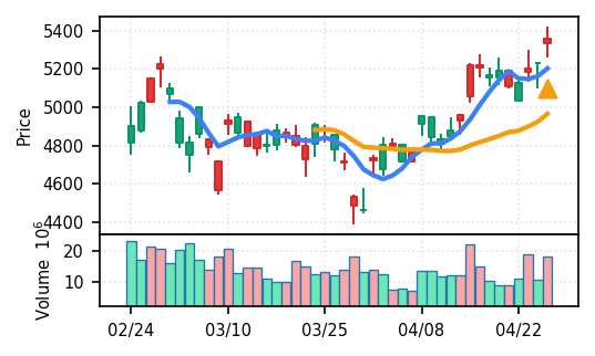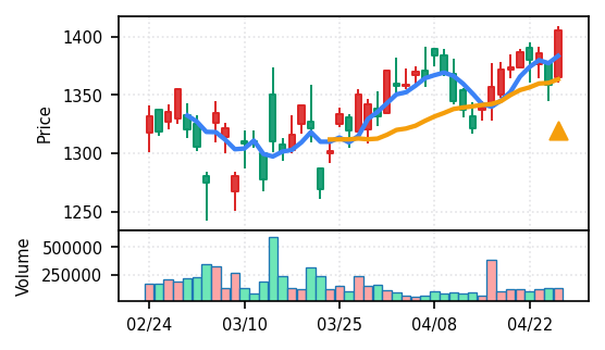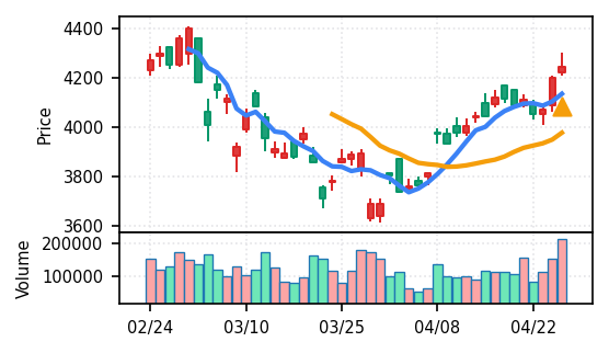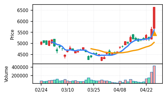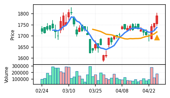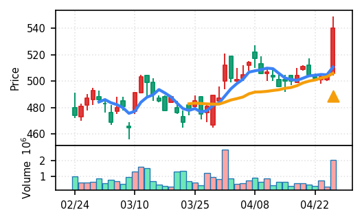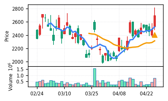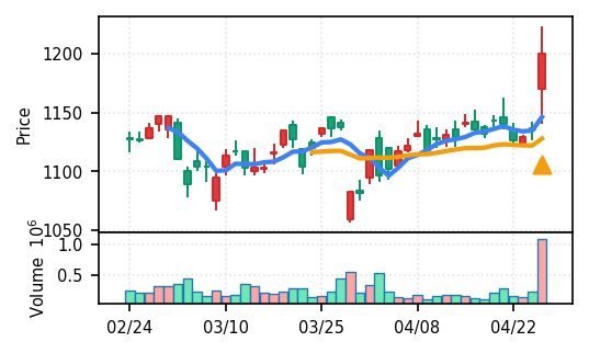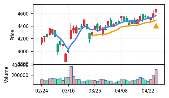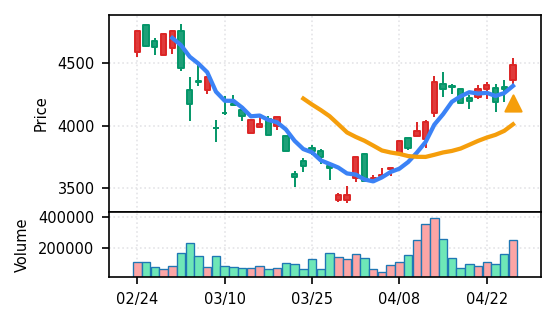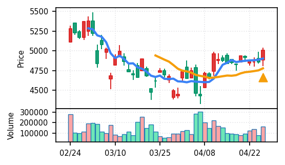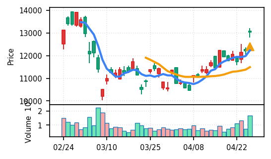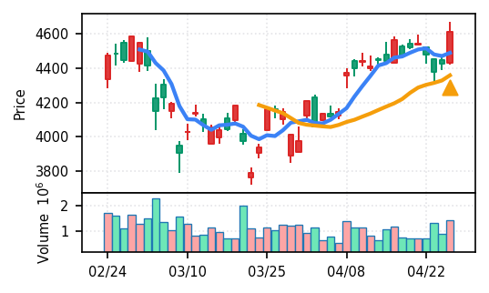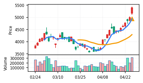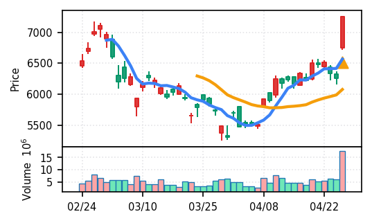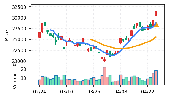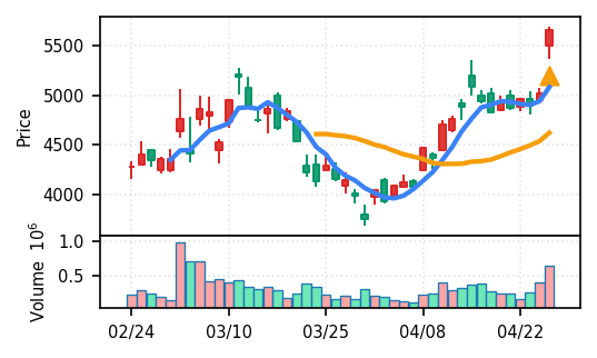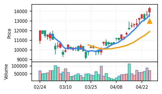 4月27日の初動検知では、合計50銘柄がブレイク条件を満たし、全体的に上昇トレンドが優勢。特に電気機器セクターの比率が高く、出来高も複数銘柄で大幅に膨らんでいる。市場全体では産業用機器・電子部品関連の需要感が強まっているとみられる。